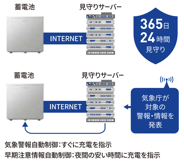 お客様が安心して蓄電システムをご利用いただけるように蓄電システムを見守るサービスです。蓄電システムのエラー発生状況を見守るだけでなく、機器のソフトウェア更新や今後の新しいサービスをネットワーク経由で提供します。