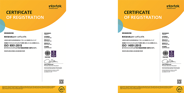 | 認証取得 | ISO14001 EMS・ISO9001 QMS 認証取得/レジリエンス認証取得/健康経営優良法人 2024 認定取得/ホワイト企業認定 2025 プラチナランク取得/SDGs 3,7,11,13,17/再エネ100宣言 RE ACTION参加/OSAKAゼロカーボン・スマートシティ・ファウンデーション参加 |