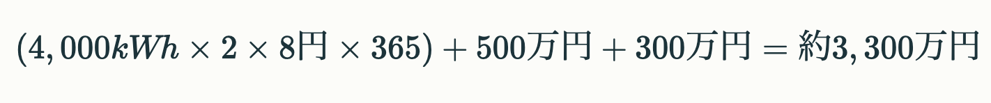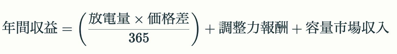 大阪市の実例では、1日2回の充放電(4MWh×2)で価格差8円/kWhを適用。これに調整力報酬(年500万円)と容量市場(年300万円)を加算すると、年間収益は、