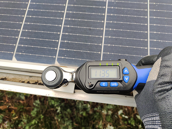 広島県 49.5kW 低圧②弊社の目視点検の様子です。大事な基礎である部分のネジが緩んでいないかチェック後、増し締めをおこないました。パネル裏のケーブルはたるんでいると雨水がたまり漏電の可能性もあるため、たるみを解消する整線作業もおこないました。