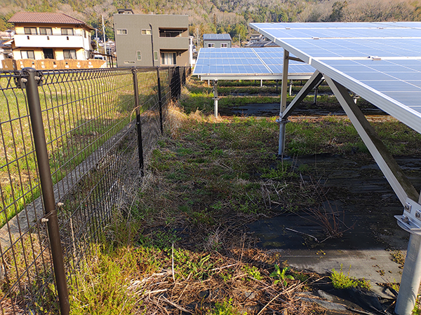 広島県 49.5kW 低圧パネル清掃、除草、電気点検を実施しました。除草シートが全体的に痛んできております。