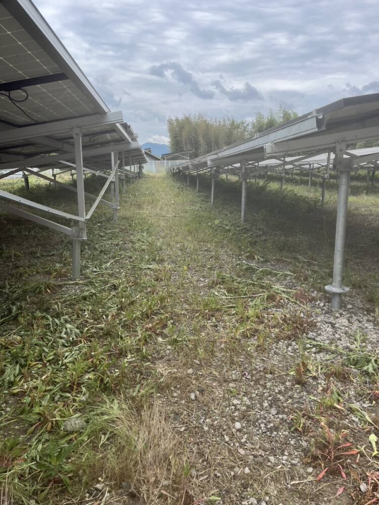 京都府 630kW 高圧京都府にて除草作業をいたしました。山からの木の侵入が進んでおり、竹や木々の伐採も実施しました。奥及び手前エリアの雑草の伸びが激しく、パネルの背丈を超えるほどの箇所もありましたが、短く除草致しました。