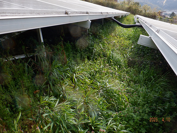 三重県 49.5kW 低圧今回は三重県の発電所で基本メンテと除草作業を行いました。東側の一部を除き全体的に雑草がかなり伸びています。南側のアレイのパネルに汚損が見つかったので、お客様にはメンテナンス内容の清掃追加をおすすめいたしました。